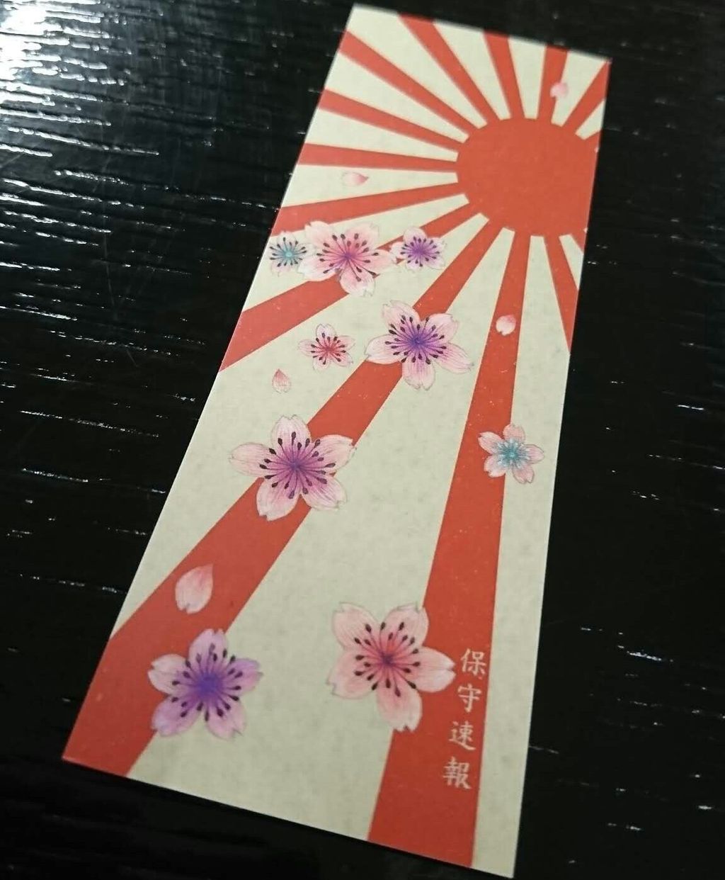 第1弾グッズはしおり。デザインは一般ユーザーから公募したもので、旭日旗と桜、保守速報の文字が描かれている。販売ページには、「単なるファングッズではなく、是非とも実際に使って頂きたい」とコメントが。その上で、