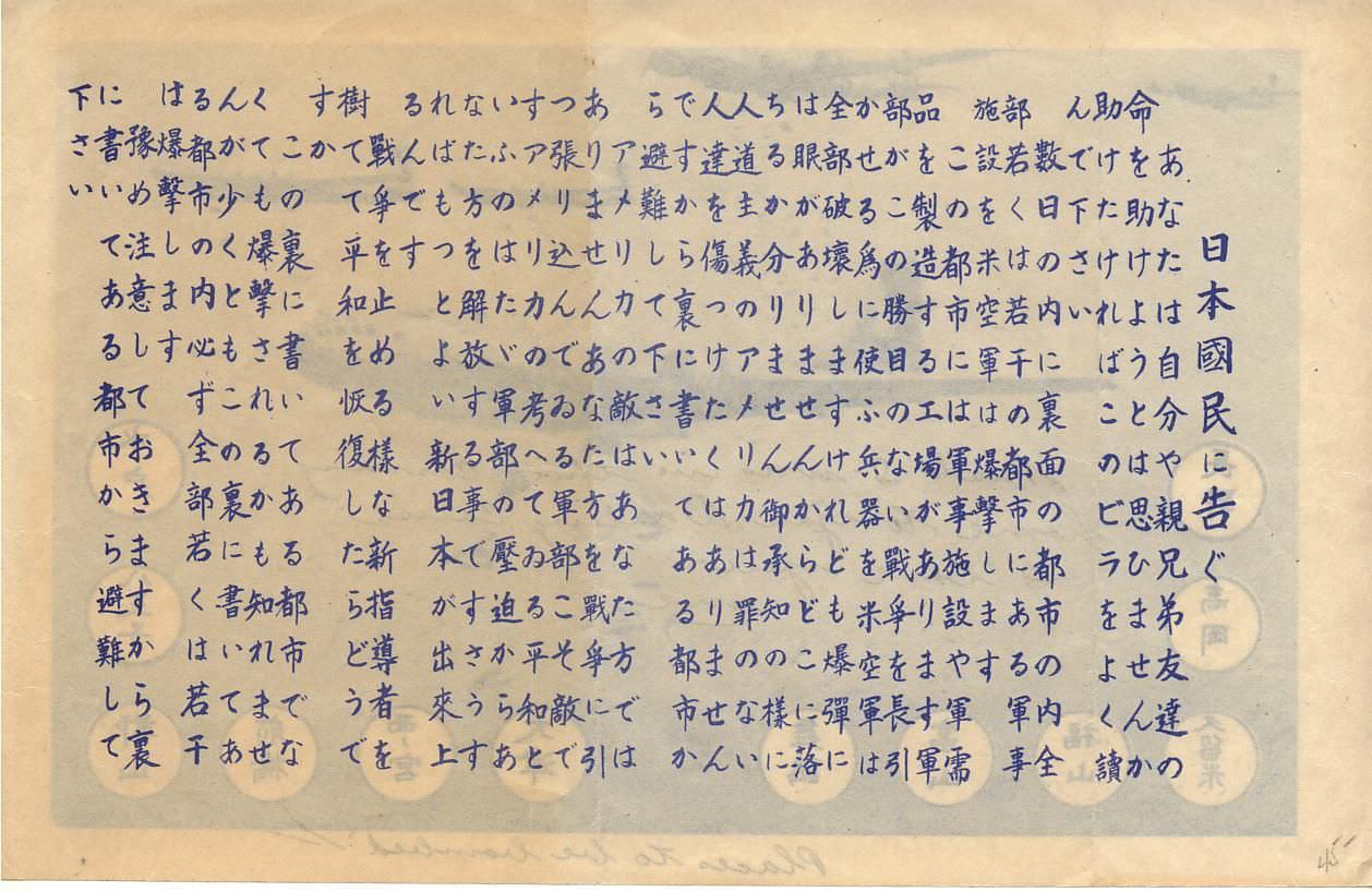 『日本国民に告ぐ』あなたは自分や親兄弟友達の命を助けようとは思いませんか?助けたければこのビラをよく読んで下さい。数日のうちに裏面の都市のうち全部もしくは若干の都市にある軍事施設を米空軍は爆撃します。この都市には軍事施設や軍需品を製造する工場があります。軍部がこの勝ち目のない戦争を長引かせるために使う兵器を米空軍は全部破壊します。けれども爆弾には眼がありませんから、どこに落ちるかわかりません。ご承知のように人道主義のアメリカは罪のない人達を傷つけたくはありません。ですから裏に書いてある都市から避難して下さい。アメリカの敵はあなた方ではありません。あなた方を戦争に引っ張り込んでいる軍部こそ敵です。アメリカの考えている平和というのはただ軍部の圧迫からあなた方を解放する事です。そうすればもっとよい新日本が出来るんです。戦争を止めるような新指導者を立てて平和を回復したらどうですか。この裏に書いてある都市でなくても爆撃されるかもしれません。少なくともこの裏に書いてある都市のうち必ず全部もしくは若干は爆撃します。あらかじめ注意しておきますから、裏に書いてある都市から避難してください。