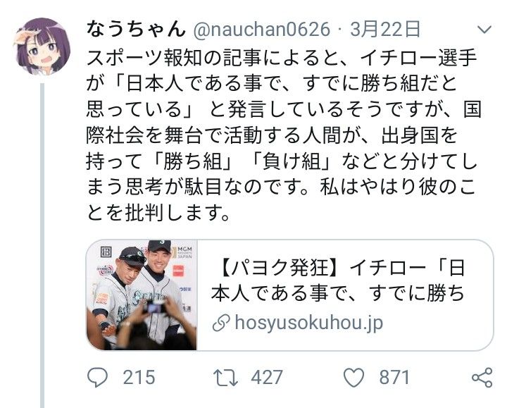 別に誰の擁護ではないが、イチローをレイシスト認定するのはおかしいと言ってる左寄りのアカウントは少なくない