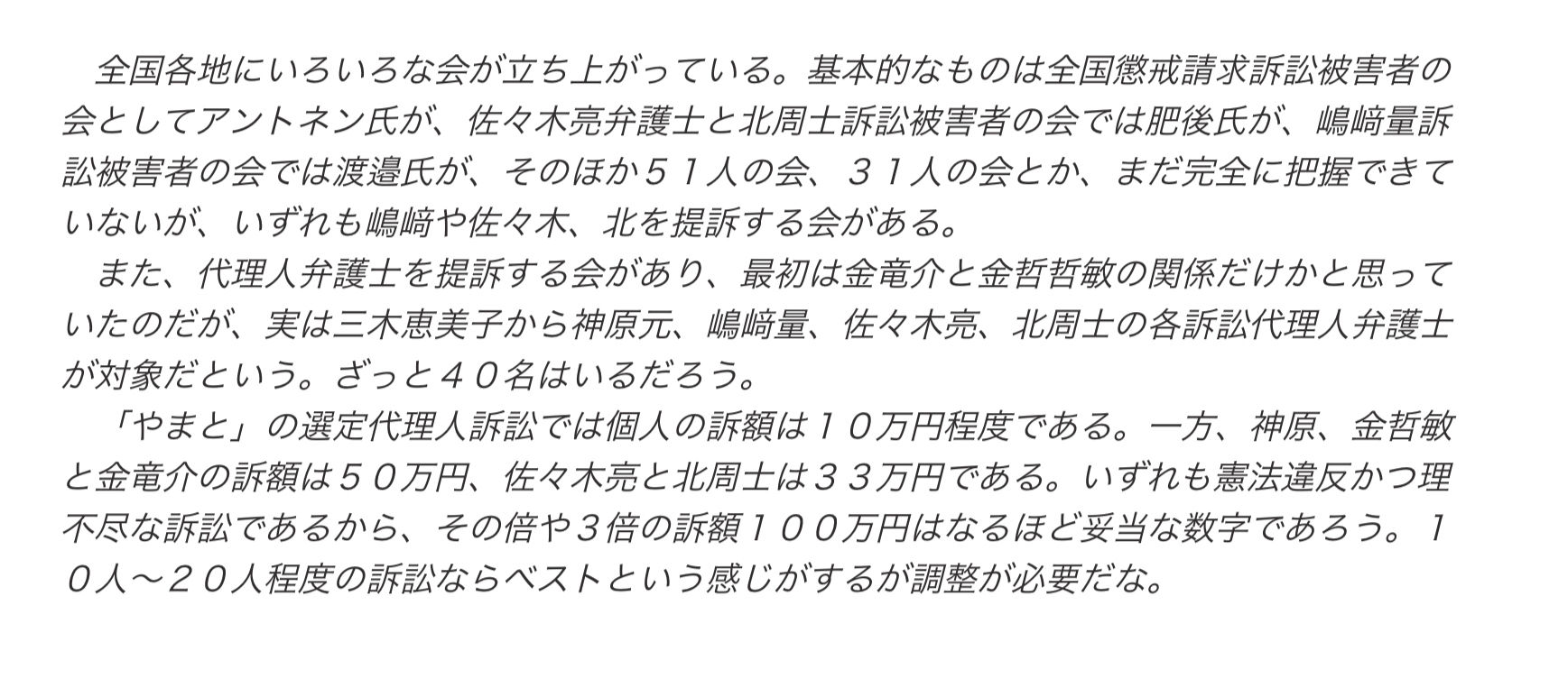 裁判関係に詳しくて割とまともな人が弁護士側(特にささきた)を批判していて、「筋が悪いから負ける」と言っていたので少し心配やった。