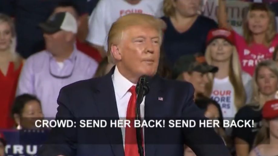 支持者の連呼は、「国に帰ってはどうか」と女性議員への攻撃を続けるトランプ氏に同調したものだが、突然距離を置いた形だ。