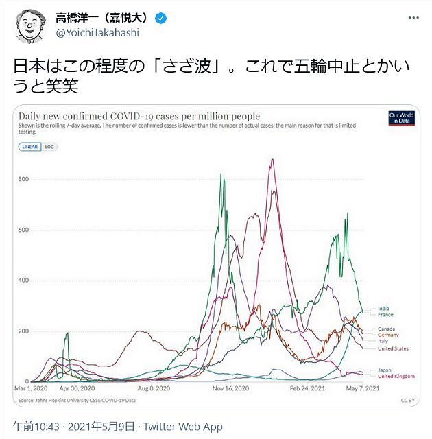 嘉悦大学教授の高橋洋一氏は、日本でのコロナウイルス感染者数を「さざなみ」に例え、"じゃあ、このためにオリンピックを中止したい人がいるってこと? 笑笑" と付け加えました。