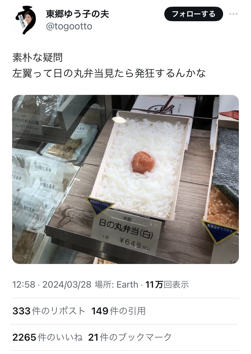「左翼って日の丸弁当見たら発狂するんかな?(ドヤッ」
