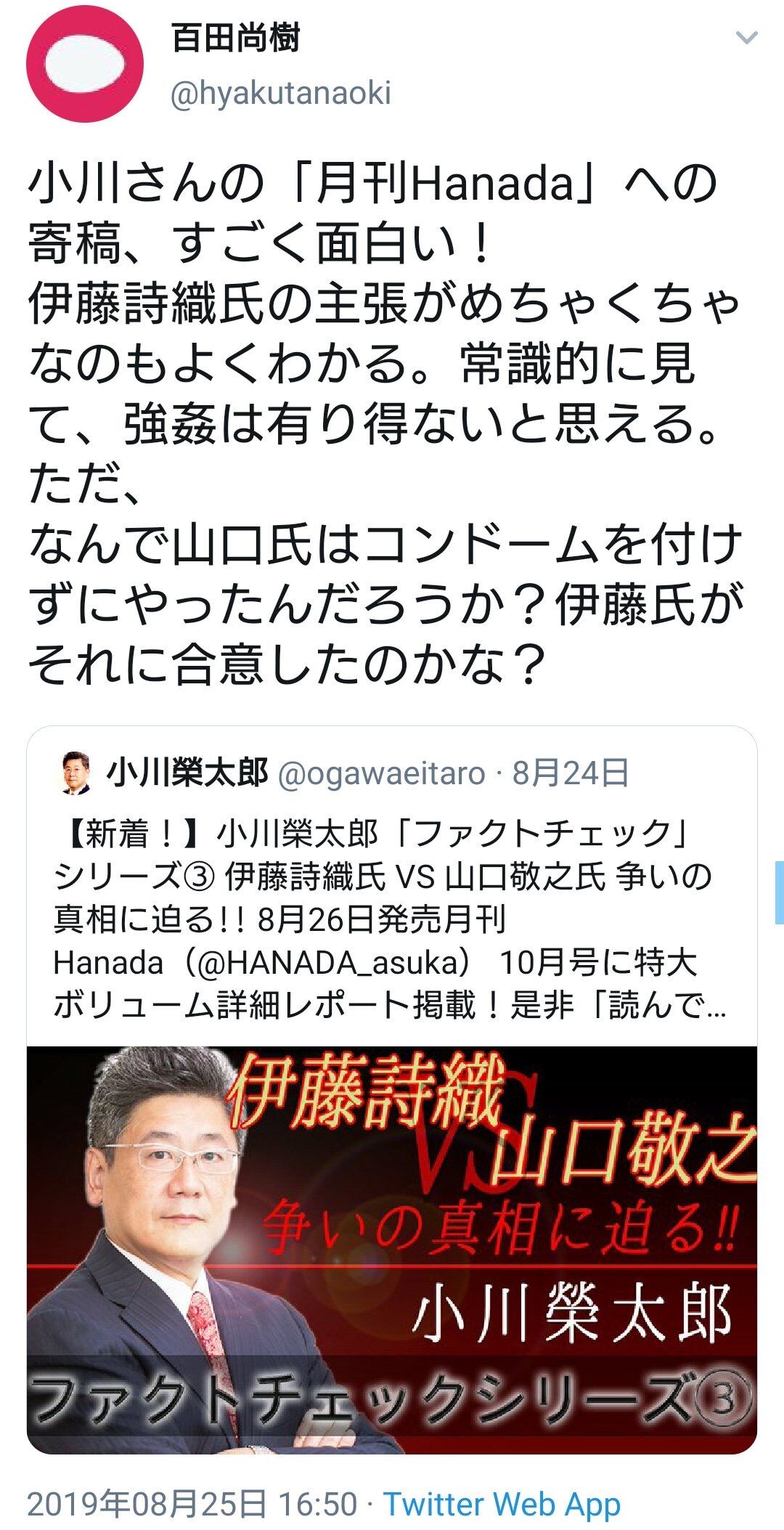 勇ましいのは自分が殴られないと思ってるときだけ百田尚樹「伊藤詩織の事件政治は全く関係ないのよ、それに私はただの見物人。中立の立場やから」