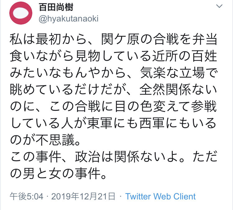 敗戦濃厚で逃げただけ272 :番組の途中ですがアフィサイトへの\(^o^)/です :2019/12/21(土) 19:04:09.82 ID:X5megXmD0.netこれ、東軍、西軍じゃなくて小早川軍だろ291 :番組の途中ですがアフィサイトへの\(^o^)/です :2019/12/21(土) 19:27:45.31 ID:+Yk04l5Yd.net余命「否が応でも第三者なのだ」