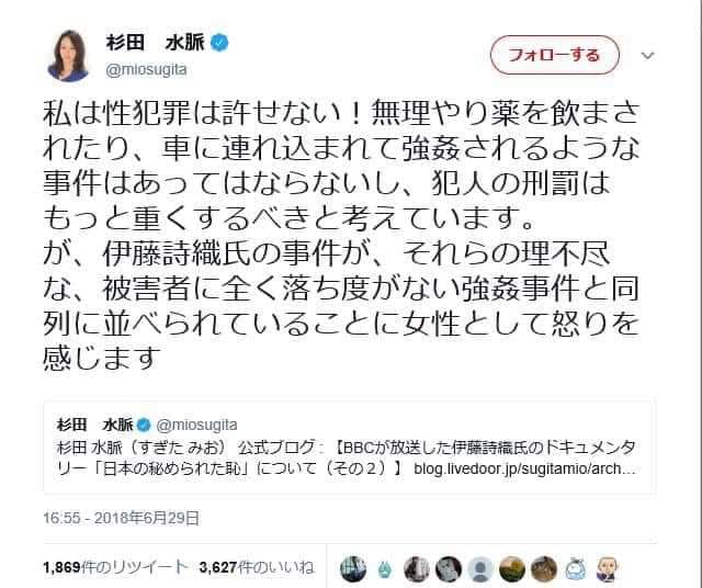 その上で同月末のブログに「伊藤詩織氏のこの事件が、それらの理不尽な、被害者に全く落ち度がない強姦事件と同列に並べられていることに女性として怒りを感じます」と批判的な投稿をしたという。