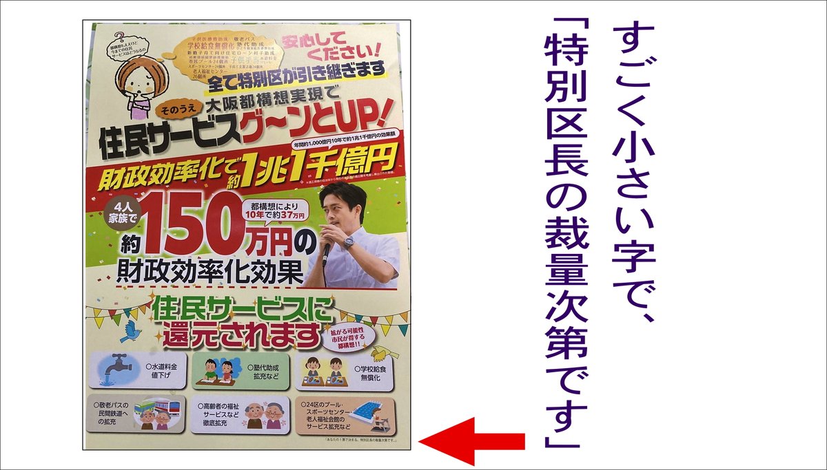 ・行政サービスは今より悪くならないですよ!→大体的に配ったチラシには小さく「選挙で選ばれた区長の裁量によります」と悪徳商法並の小細工が施されている