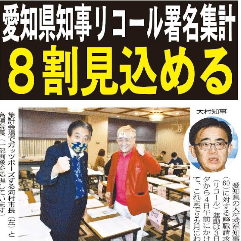 愛知県の大村秀章知事に対するリコール運動は、選挙管理委員会へ届けられた署名の合計が約43万人分でした。