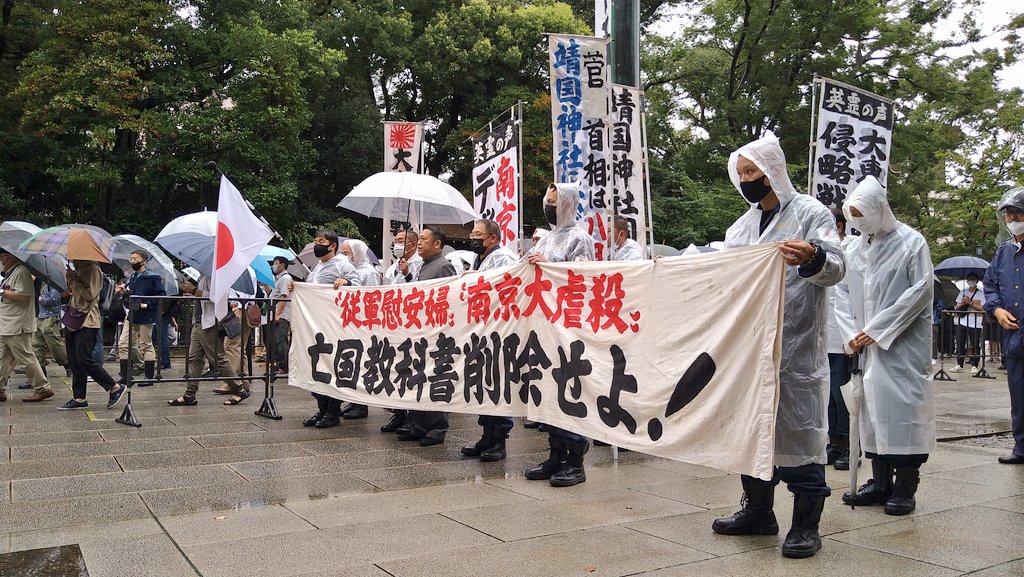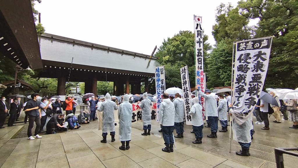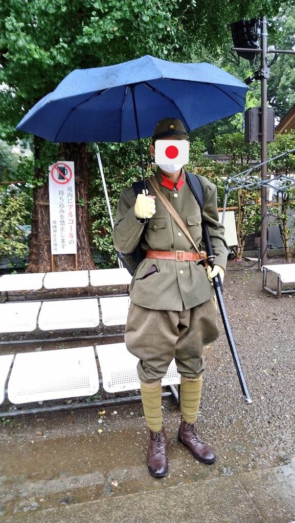 m9(;゜Д゜)つ<令和3年終戦記念日。靖国神社なう。今年は雨なのでコスプレはこの方と「数人」雨宿りしてました。てなわけで撤収ッ!