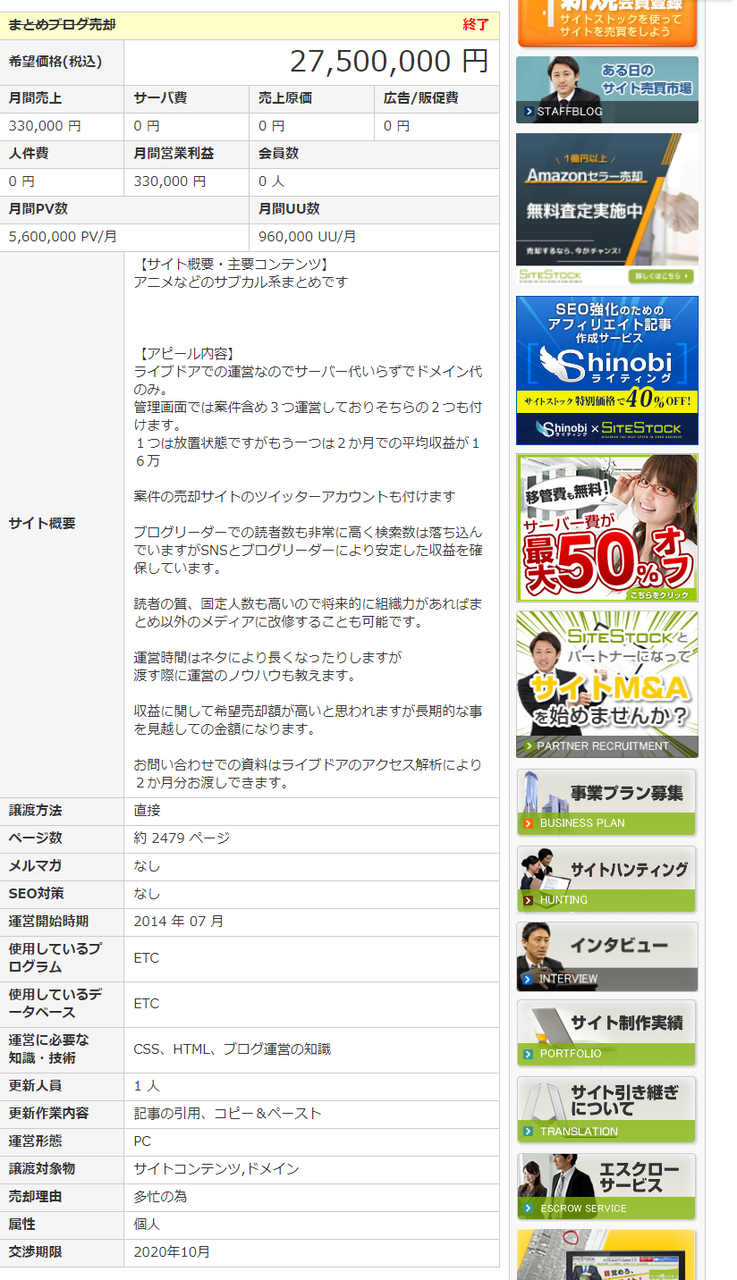 ちょっと待て2750万円?(希望価格だから実際にそれで売れたかはわからんが)…月間PV560万となると相当な人気だから名の通った有名なブログなのかもしれない。こうやって人知れず管理人がチェンジするんやね