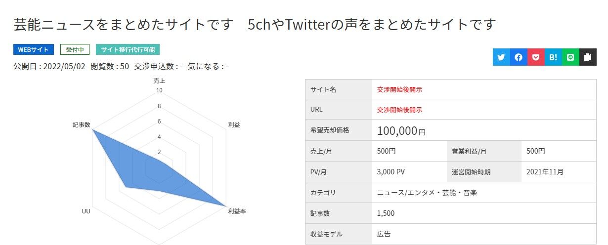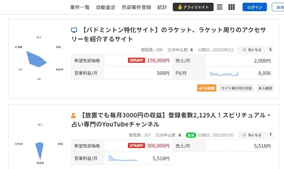 このようにwebサイトやYouTubeのチャンネルが売られてるようです。確かにサイトは立ち上げてから人を集めるのが一番難しい。ある程度育って常連も定着してるのを引き継ぐ方が楽かもしれない…