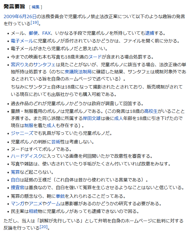 >電子メールの添付ファイルを「開かなくても児童ポルノかわかる」、「警察が冤罪を起こすはずがない」という趣旨の発言を行ったため、同時期に問題となった足利事件との関連より、冤罪に関する認識の低さと改正案に反対する人々からの反発を受けた