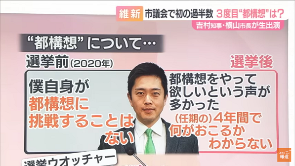 これを受けて、ABCテレビの木原善隆コメンテーターは「もし都構想を再挑戦するのであれば、公約に掲げた上で次の選挙で民意を問うべきでは」と指摘。