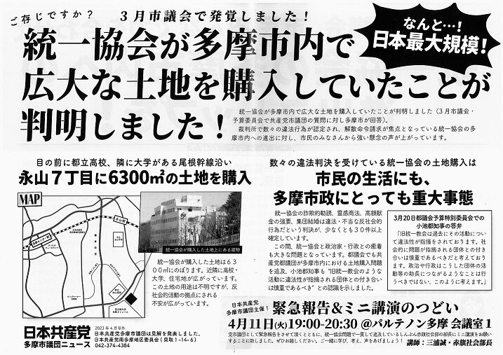 旧統一教会(世界平和統一家庭連合)が、多摩市内で約6300平方メートル(1905坪)に及ぶ広大な土地を購入していた。3月の多摩市議会で、日本共産党市議団の質問に、市が事実を認めたのだ。