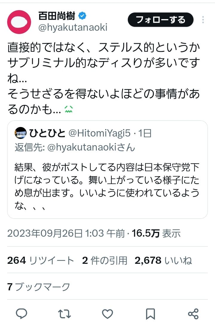 わいは、百田は次は維新とお互いダメージにならない話題で論争して、結局融和すると睨んでるで
