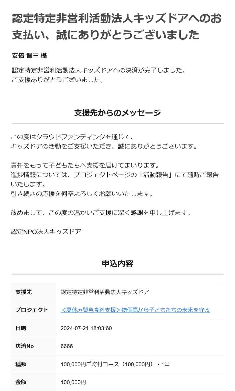 寄付者コメントが安倍晋三だらけに