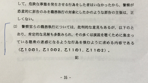 >>44 男性については、大声の連呼に立腹した聴衆とトラブルになる具体的な危険性があったと指摘。男性が警察官の警告を無視して連呼したこともあわせ、警察官の行為は警職法に基づき適法だと判断した。