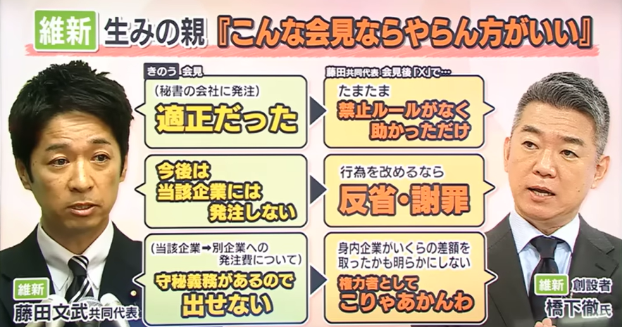 - 維新の共同代表である藤田に公金還流疑惑が持ち上がった