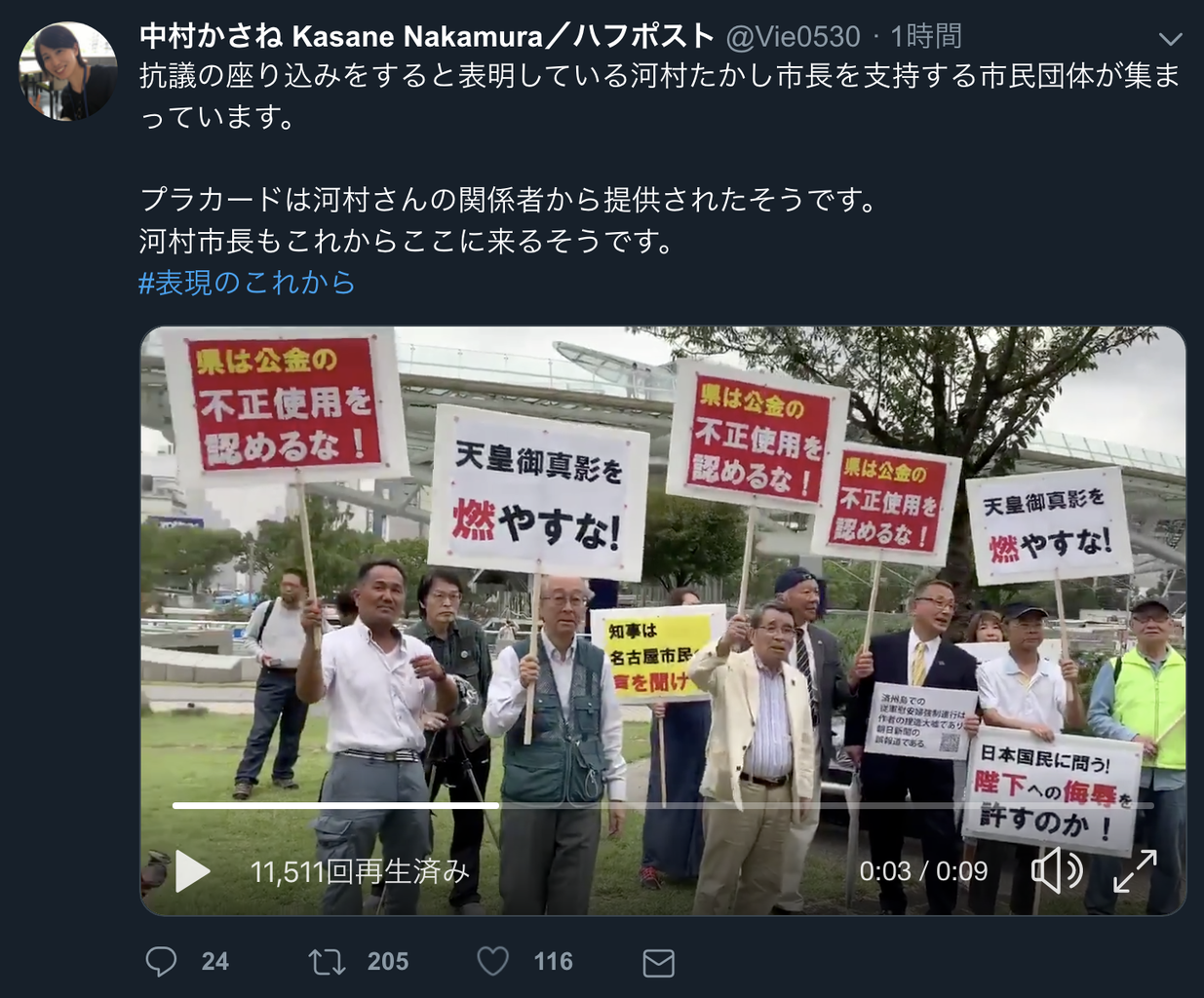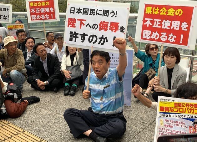 河村たかし市長がトリエンナーレ会場前で座り込みしています。
