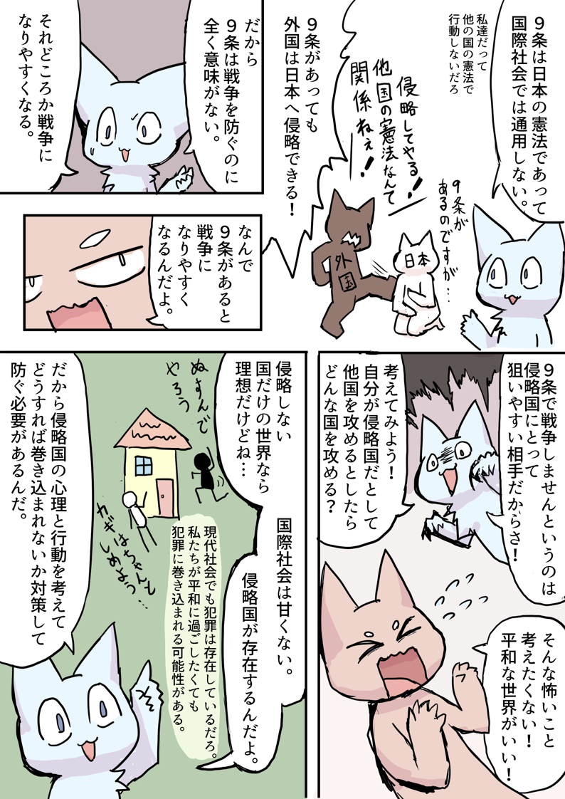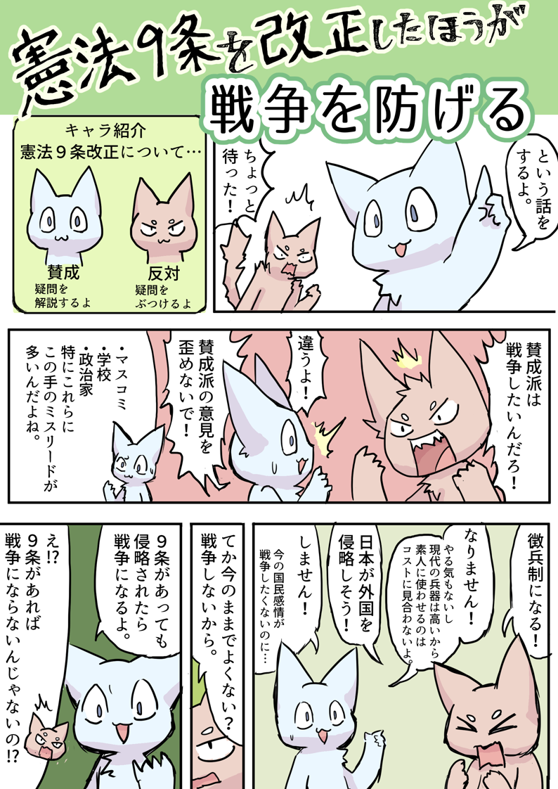 問題となっているのは、憲法改正についての19日の投稿。「もやウィン」という架空のキャラクターが4コママンガで、