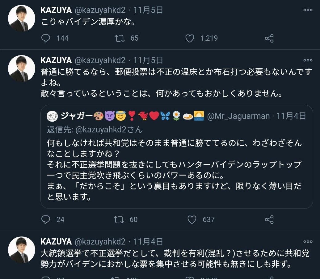 KAZUYAさんは大統領選後も「不正選挙」を叫んでデマを広めまくるトランプ信者に批判的だった。それに対し百田尚樹が事実上名指しで